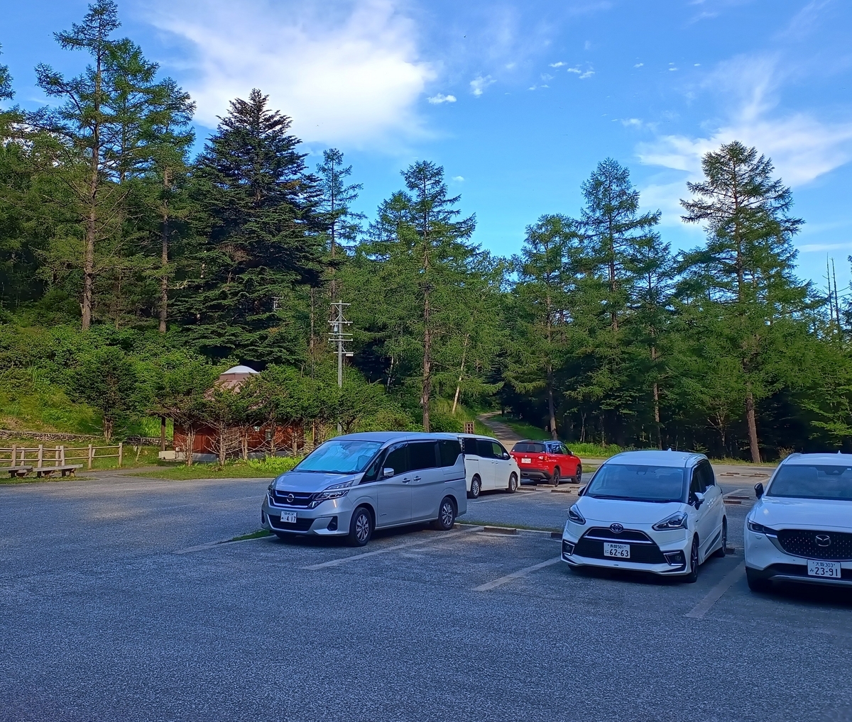 中央道飛ばして2時間ほどかかって駐車場着。ド田舎山奥ですが綺麗な駐車場でした。一部未舗装路ありですが、普通車2駆でも余裕。そして中房温泉に比べて劇的に空いている。キレイな水洗トイレもあって、車中泊も快適そうでしたよ。