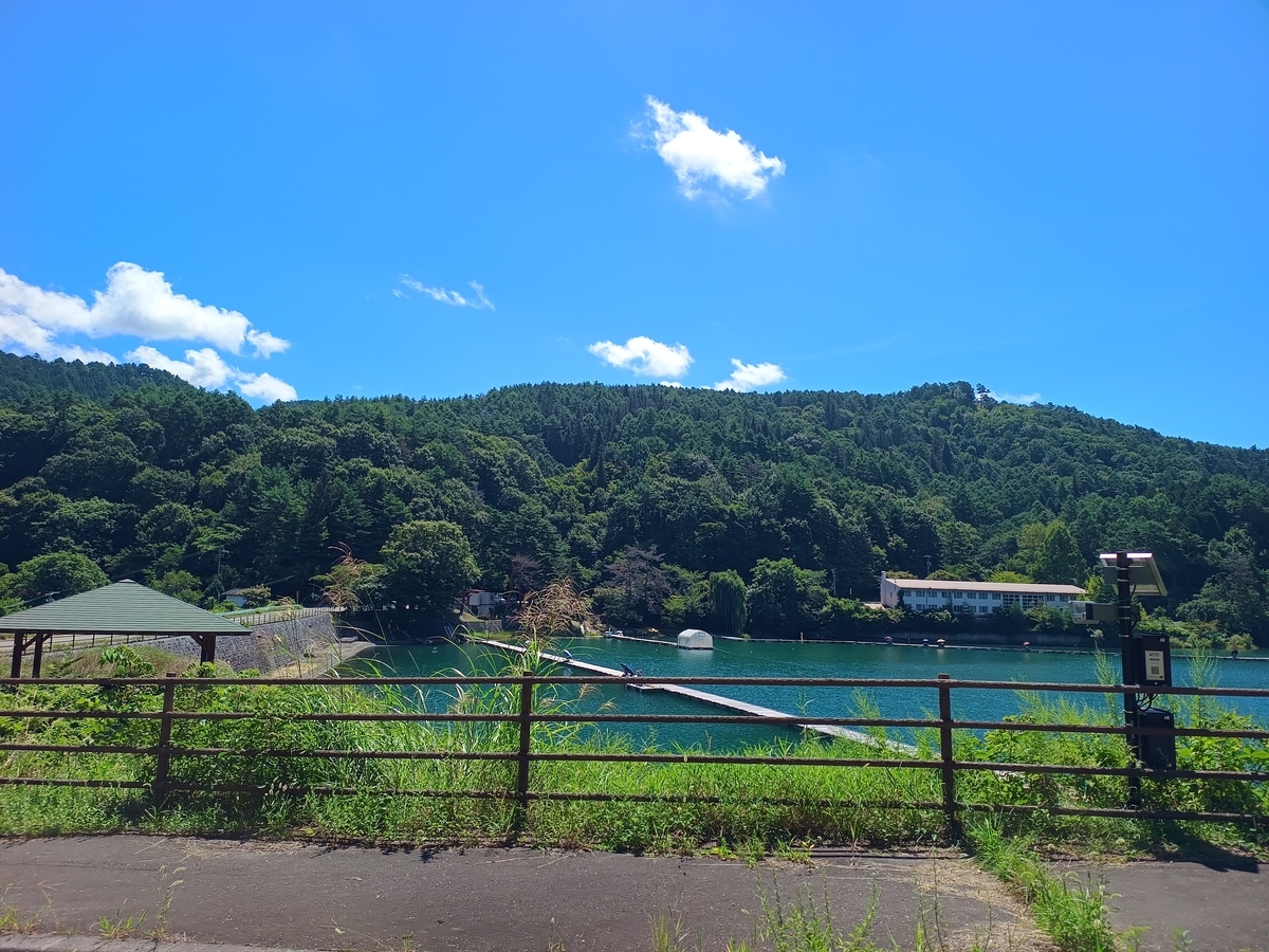 激坂区間を何とかクリアして、美鈴湖畔で一旦平坦となります。のんびりと釣り人を眺めながら、脚を休めます。