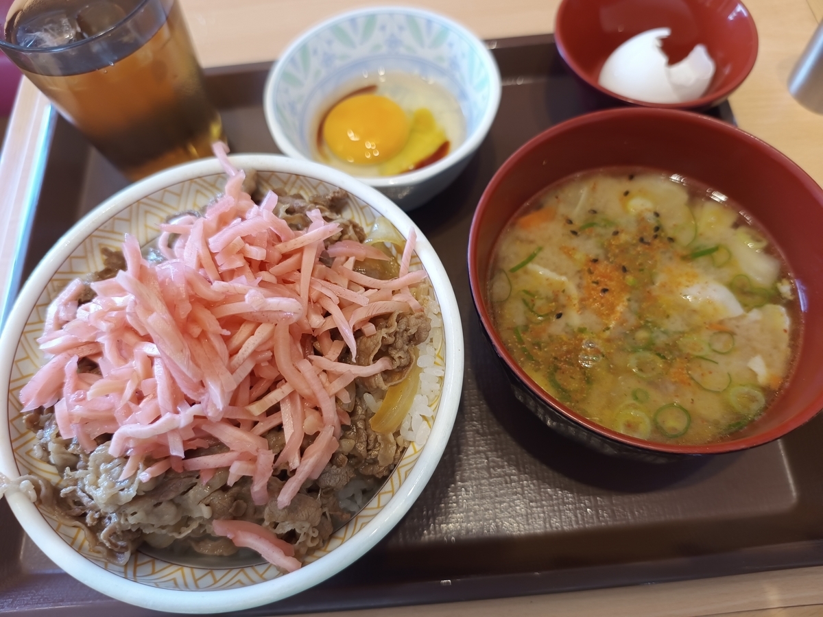 帰り道に牛丼大盛の昼食。贅沢に豚汁も付けました。ヒルクライムで消耗した体に最高に美味かったです。