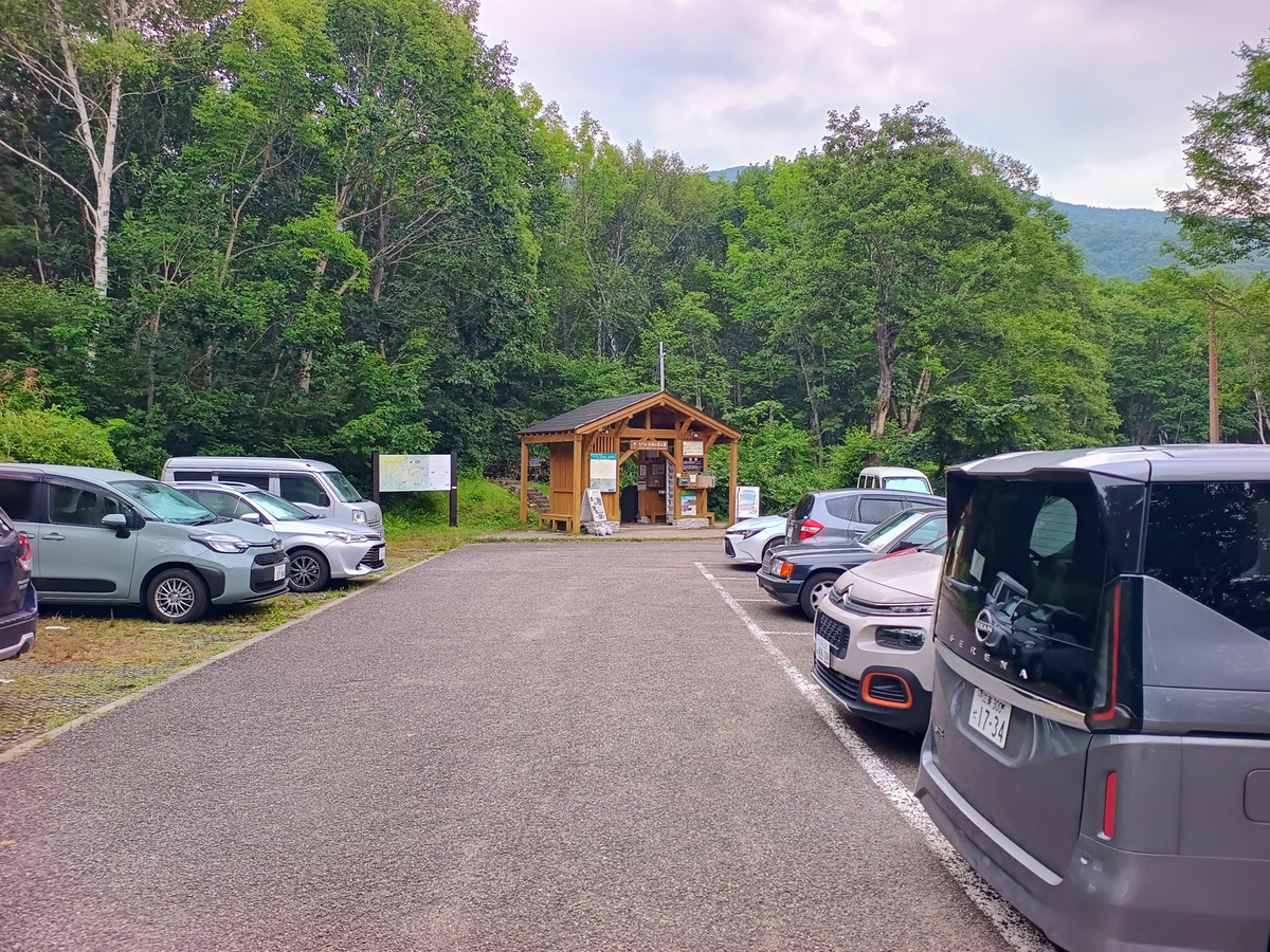 妙高高原ICを降りて妙高高原に進み、スキー場の中の道路を詰めて登山口である笹ヶ峰までやってきました。道路はとてもいい道でしたが、大学生かな?早朝から山道を走っている学生がめっちゃ一杯いました。こんな急勾配の山道走ってトレーニングしたら強くなれるわ。
