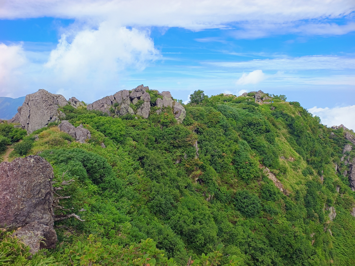 続いて南峰へと進みます。途中にある日本岩という岩塊。妙高山の最高地点は南峰2454mとなります。