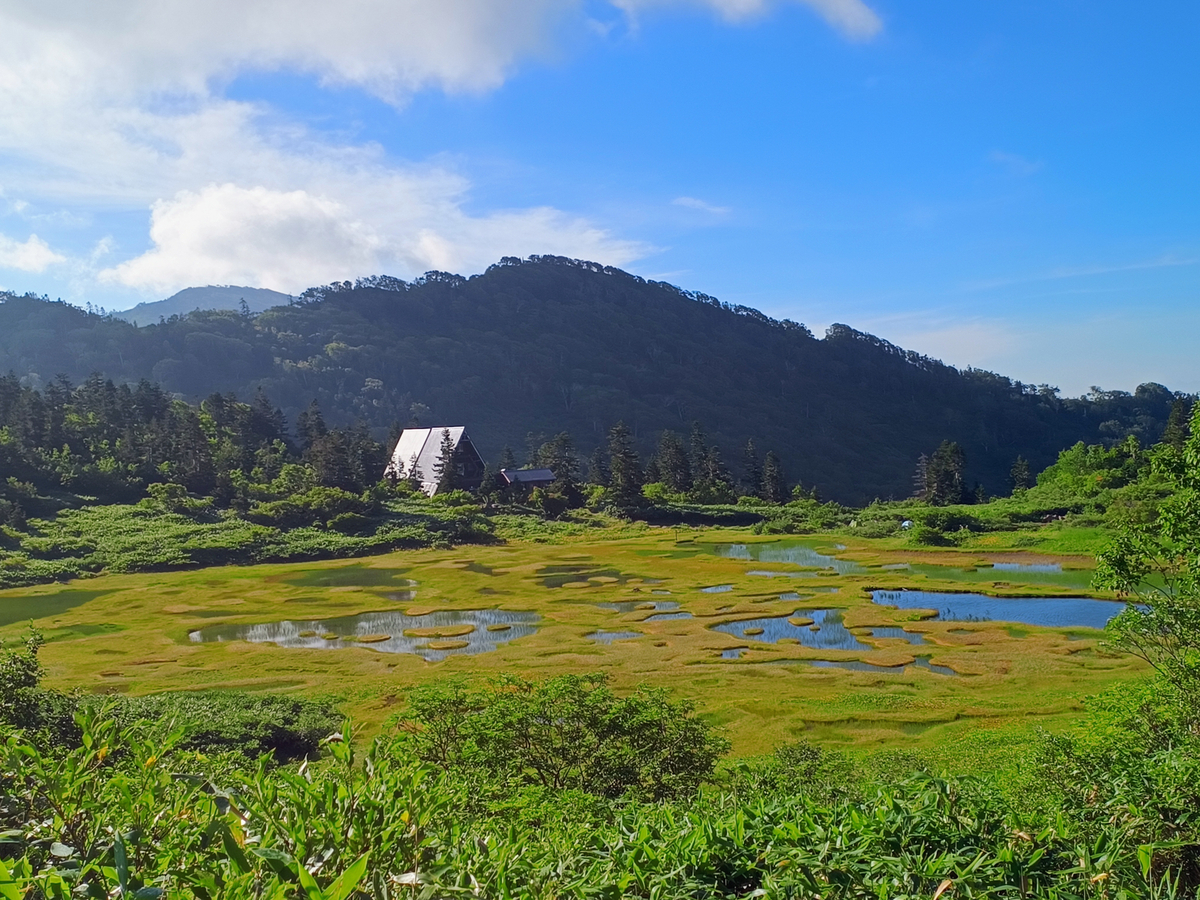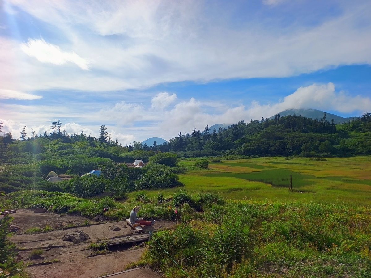 すぐ目の前が高谷池という湿原。火打山と焼山も見えます。ナイスロケーションですねー。